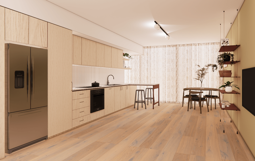 The material selection reflects the vibrant urban environment, with stylish terrazzo benchtops, powder-coated metal leg details, and integrated appliances creating a sleek, contemporary feel. Thoughtful storage solutions maximize every inch of the space, enabling the client to navigate the kitchen and living areas in an organized and efficient manner.